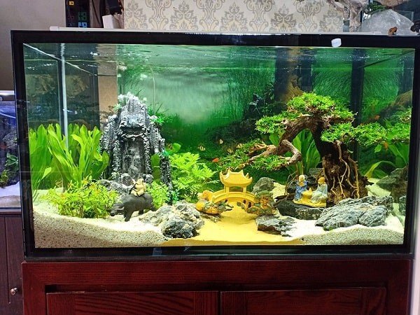 Sỏi biển 2-3mm phù hợp với bể bé, layout và lũa vừa phải, trải nền khoảng 2-4 cm.